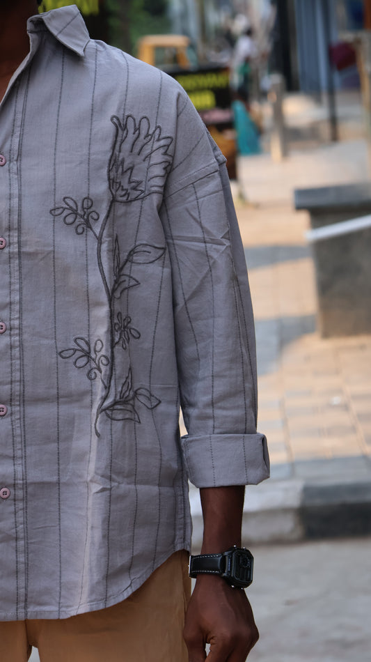 Grey Floral Embroidered Striped Shirt – Modern Statement Wear