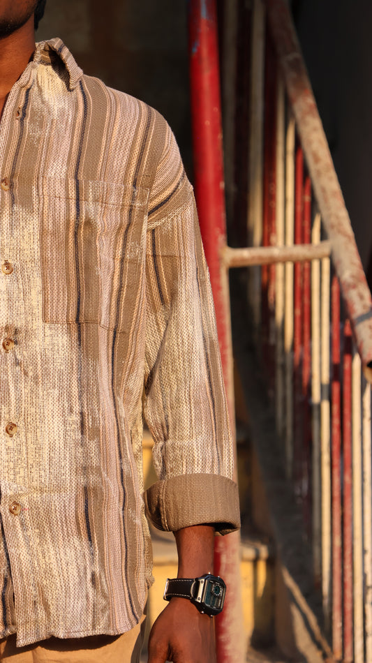Earth-Tone Distressed "Flame-Arrow" Oversized Overshirt