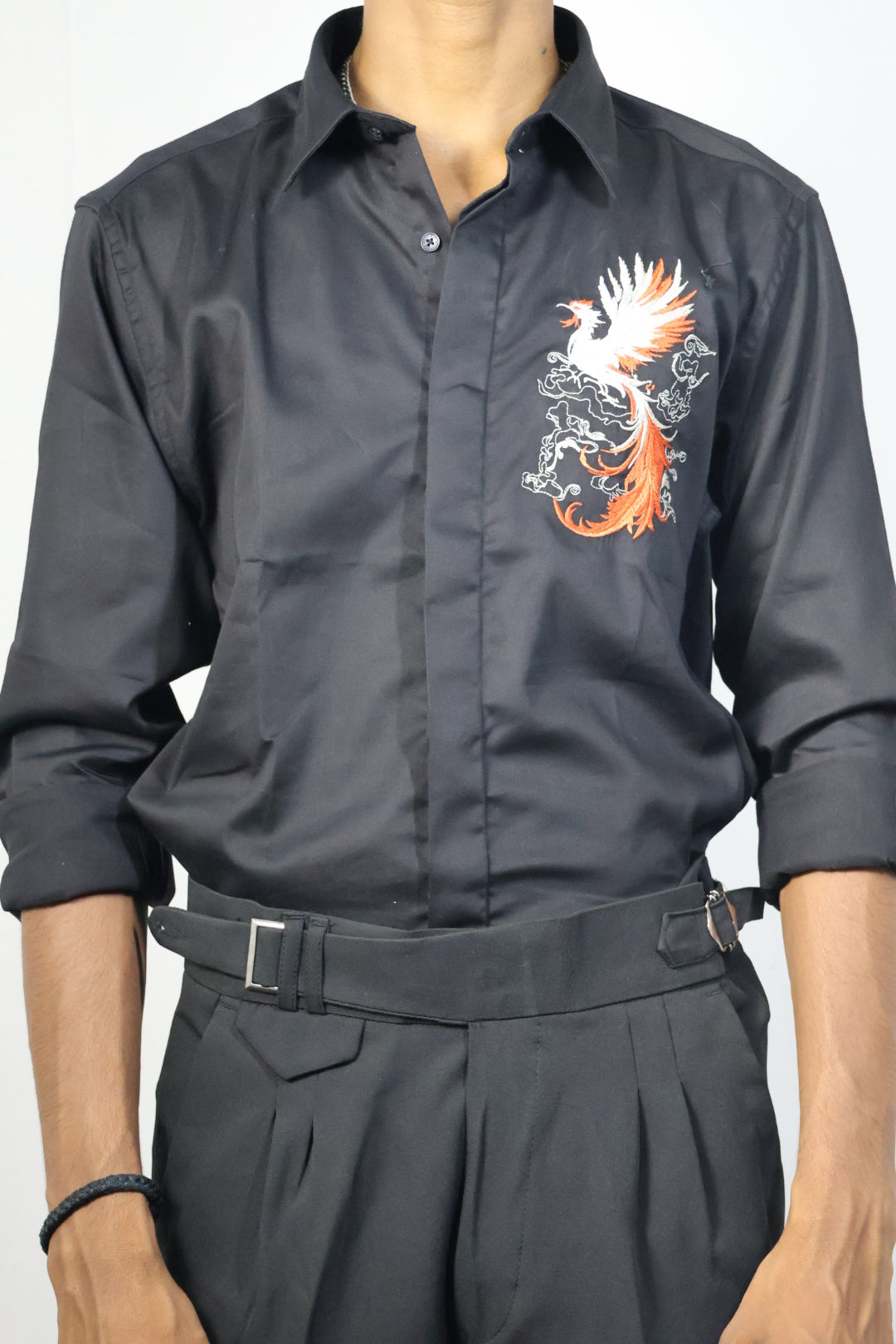 • Details: Full front button placket, single chest pocket, pearl buttons, roll-tab sleeves