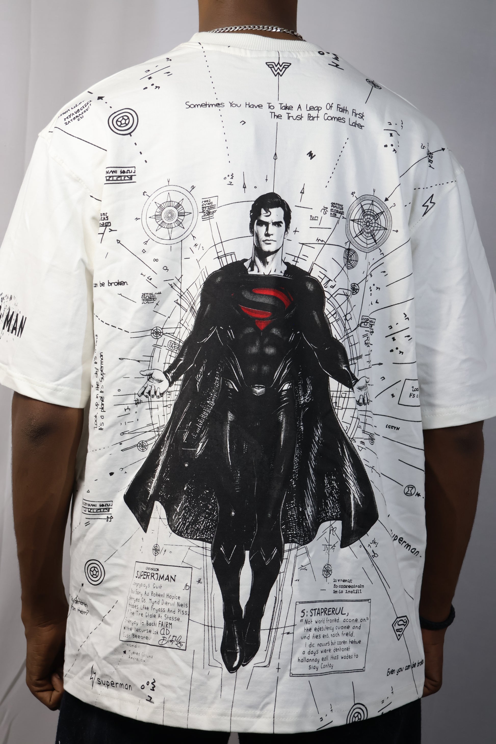 This unique white tee breaks the mold with an incredibly detailed, artistic depiction of the Man of Steel. The back graphic features a striking, almost monochromatic illustration of Superman with his cape flowing dramatically, surrounded by complex blueprint-style sketches, symbols, and handwritten notes about his identity and philosophy. It's a true collector's piece that goes beyond a simple logo.