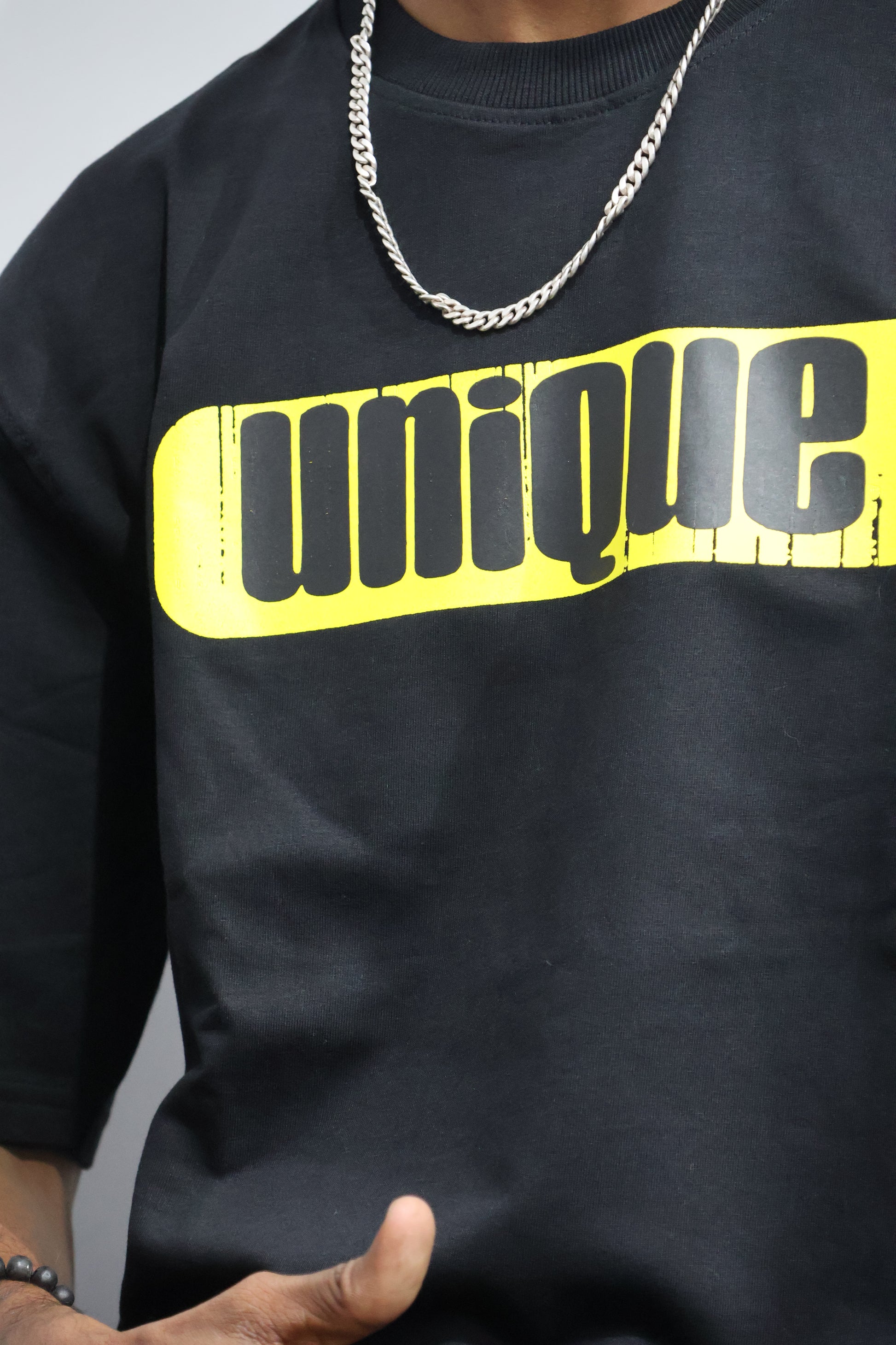 • Bold Front Print: Yellow “UNIQUE” typography