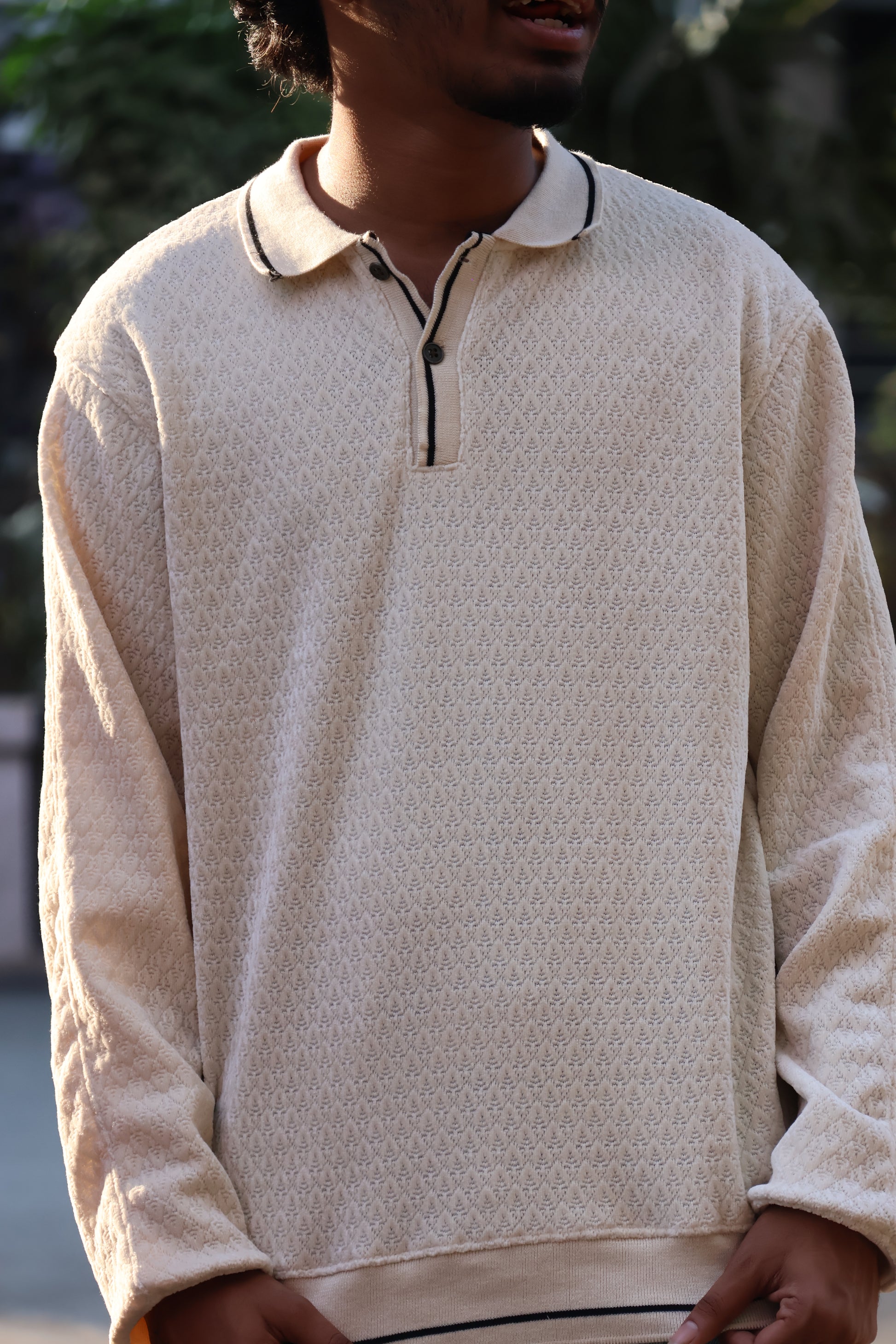 Textured Knit Oversized Polo – Cream/Sand