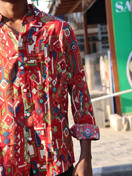 Tribal Fusion Geometric Print Shirt – Crimson & Multi