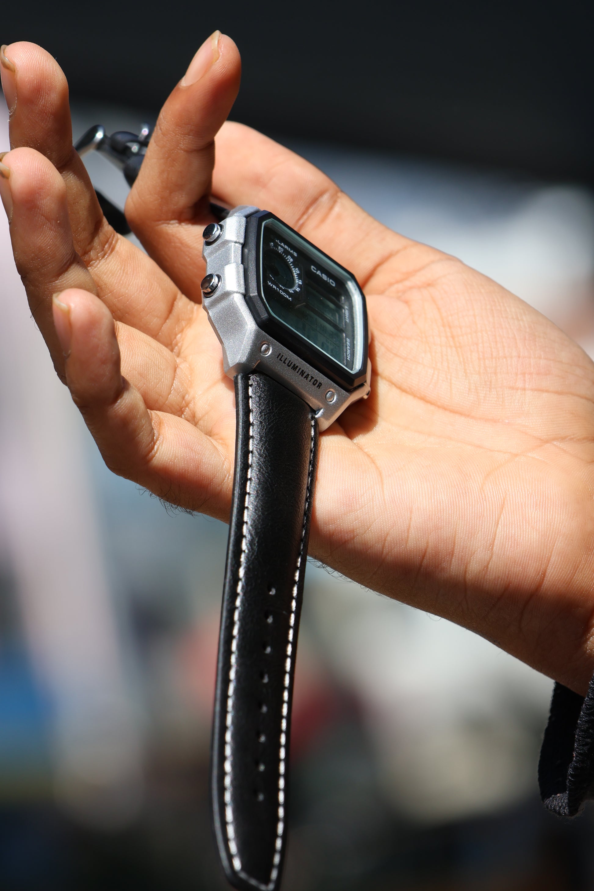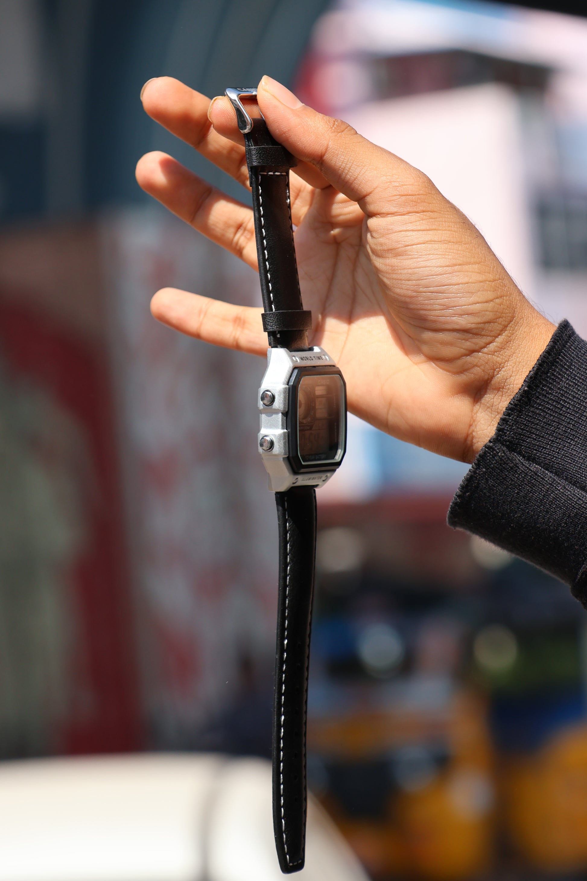 Casio World Time Digital Watch – Silver Case with Black Leather Strap