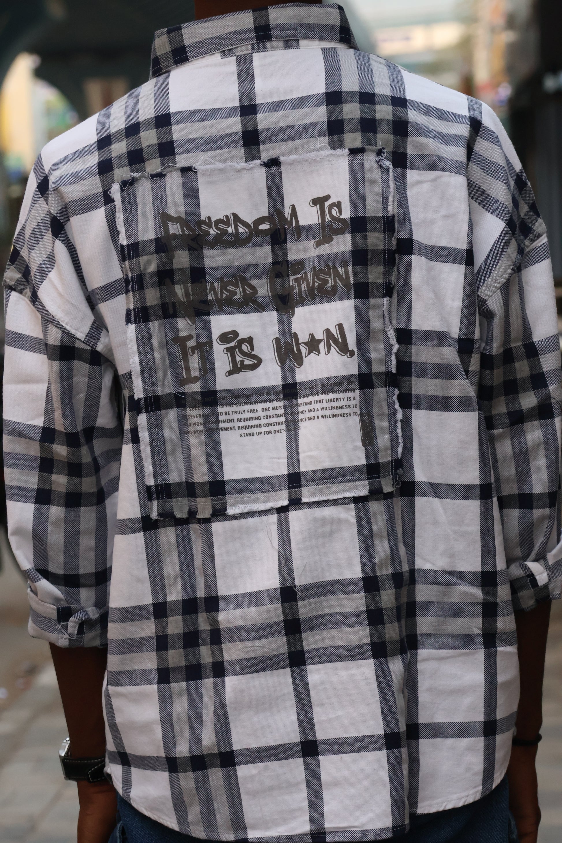Freedom Is Won" Distressed Plaid Flannel printed shirt